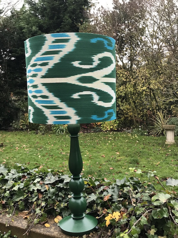 green and turquoise ikat drum on puck green wooden lamp base Posted on 9th November 2020 at 5:47 pm by Sarah / / 0 Ikat design dark green and turquoise wth matching lamp base IMG_0012