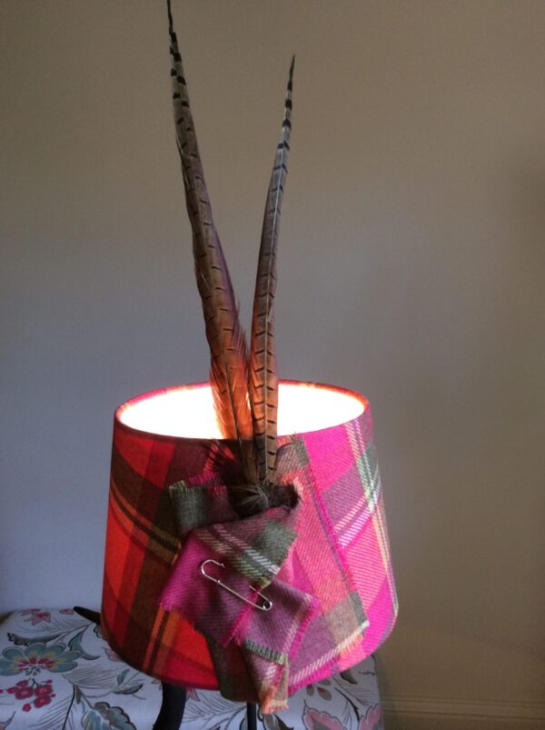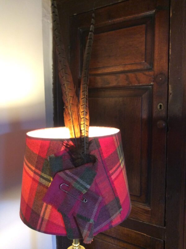 A high quality tapered lamp shade, hand crafted in the heart of Yorkshire using a 100% lambs wool made from a Yorkshire based company, Abraham Moon which is one of the last remaining vertical woollen mills in Great Britain with a reputation for consistent quality and innovative design and dressed with a pheasant feather and a kilt pin to create a country style design.