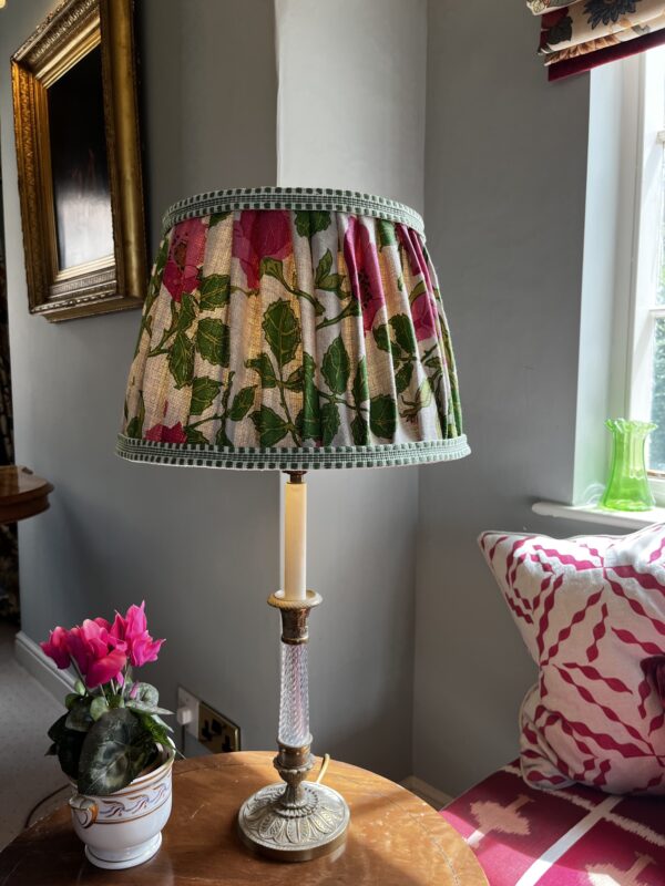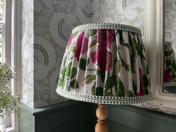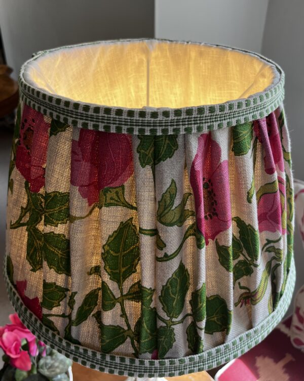 Love this Lampshade – Christopher Farr printed this Linen Fabric to celebrate the Coronation of His Majesty King Charles III – Richmond in Hot Pink trimmed with a unique green and cream dash print and the interior is lined in an ivory linen – the finished shade is fresh, unique and a fabulous lampshade.