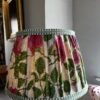 This lampshade is made from a cotton fabric with a fantastic Royal blue and Black-eye Ikat Design – simply looks great – th interior is lined in an ivory linen – the finished shade is fresh, unique and a fabulous lampshade.