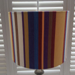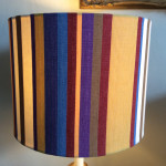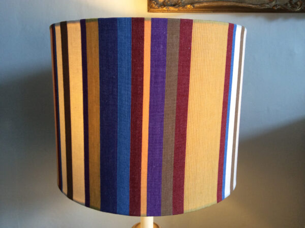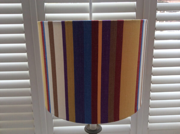 A high quality drum lamp shade, hand crafted using a 100% yarn dyed cotton in The Stripes Company fabric. This lamp shade looks stunning, especially when illuminated as each of the colours; Apricot, rust, blue, off white, cinnamon, mustard and purple coloured stripes are picked out by the light of the bulb and creates a warm light which works well in all rooms.