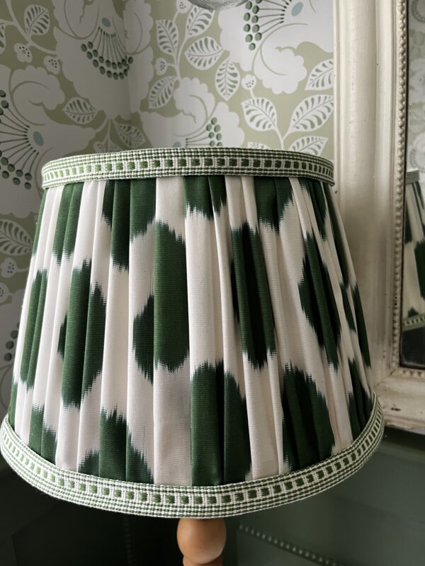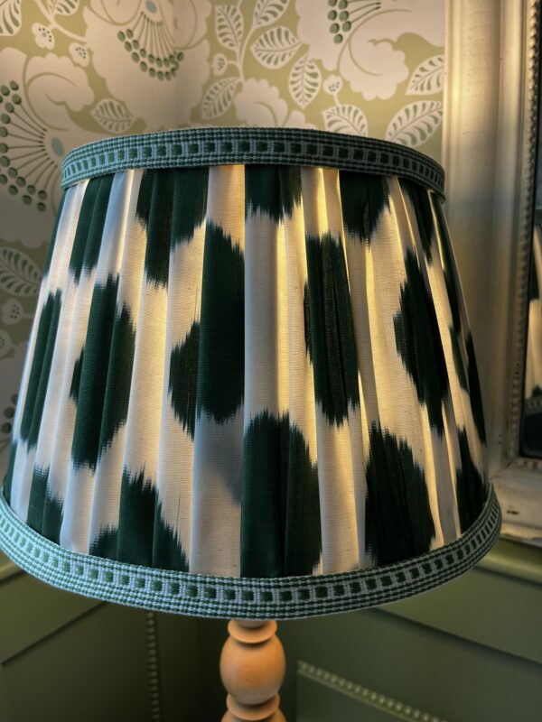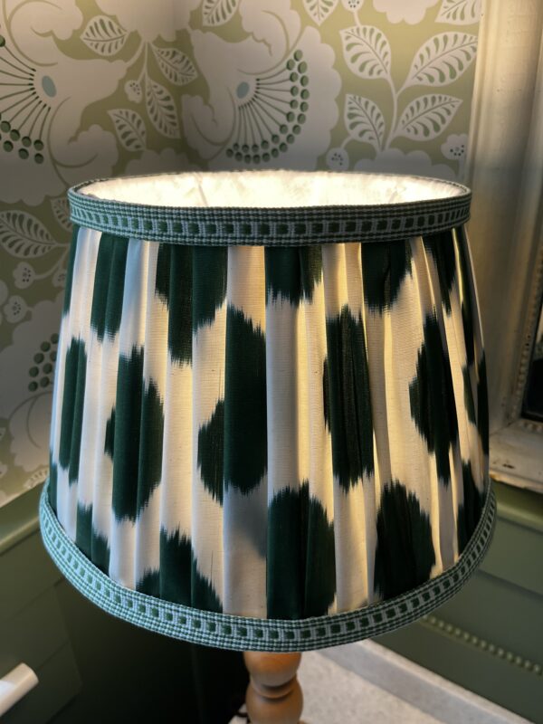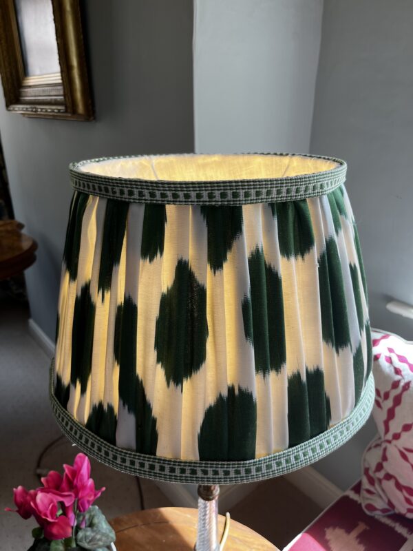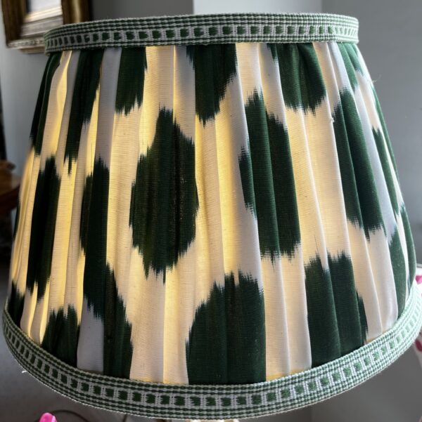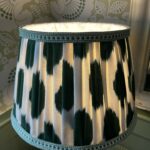 This lampshade is made from a silk fabric with a fun ivory and green polka dot Ikat design – the edges are trimmed with a linen compliementary dash design and the interior is lined in an ivory linen – the finished shade is fresh, unique and a fabulous lampshade.