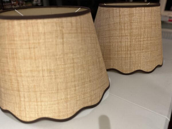In addition this lamp base can be purchased with a matching lampshade made from natural raffia on a cream card lining, with a straight or scalloped edge trimmed with an ivory bias. See Raffia section.