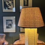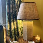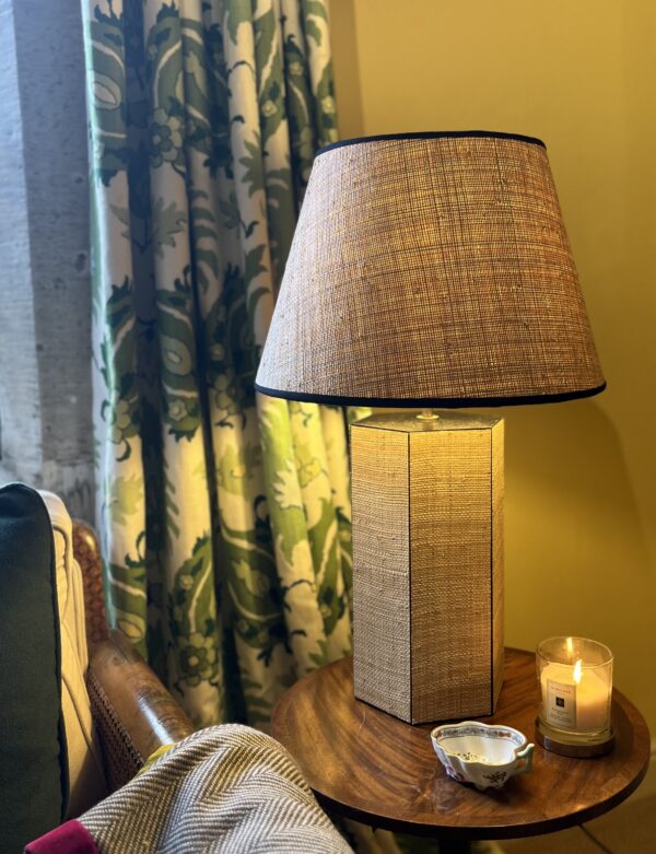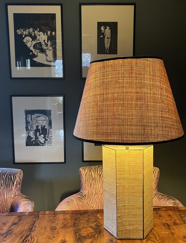 The lamp base is painted Black and uses natural raffia to decorate the six sided hexagonal wood base. The finished product is a stunning lamp which would make a perfect addition to any beautiful home.