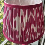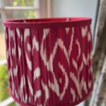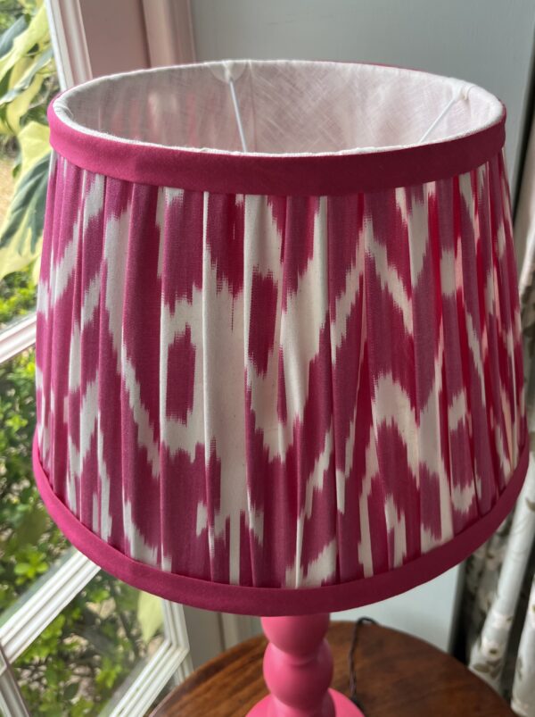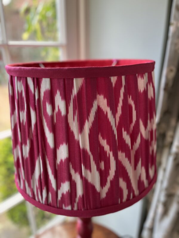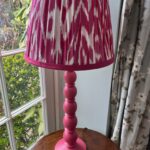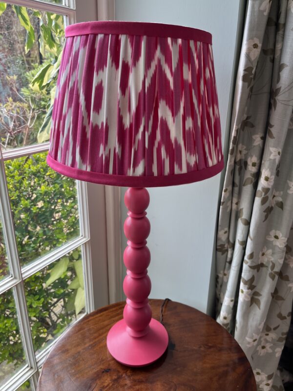 The lampshade is made from a traditional Ikat design on cotton fabric in a cheerful cerise pink & white colourway. This makes a fabulous lampshade and paired with the Yorkshire hand turned wooden lamp base made from Sycamore wood painted in Little Green, Leather to pop out the colour of the Pink in the ikat design – but if you would like a colour of choice on a lamp base please get in touch to discuss.
